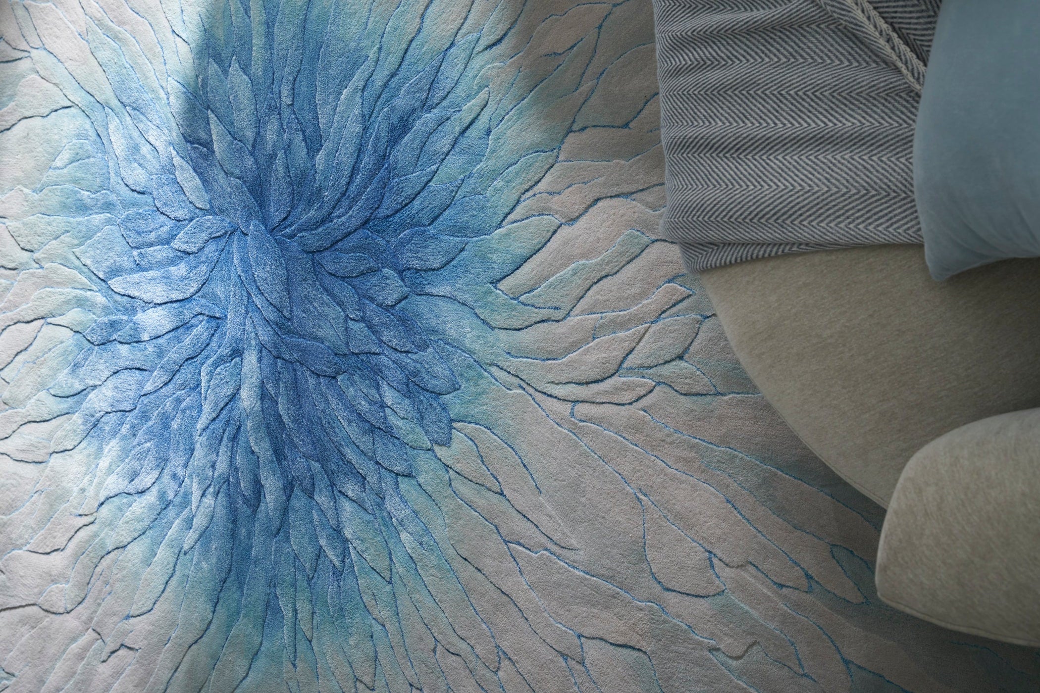 Bring a bold sense of movement to your space with this handcrafted rug from the Canvas Collection. Made from a luxurious blend of New Zealand wool and bamboo silk, this piece features oversized abstract floral forms in vibrant shades of blue, indigo, and amethyst, outlined with golden accents. The rich textures and painterly color transitions create a striking visual effect, while the natural sheen of bamboo silk adds depth and softness. Perfect for modern interiors, this rug balances artistry with comfort.