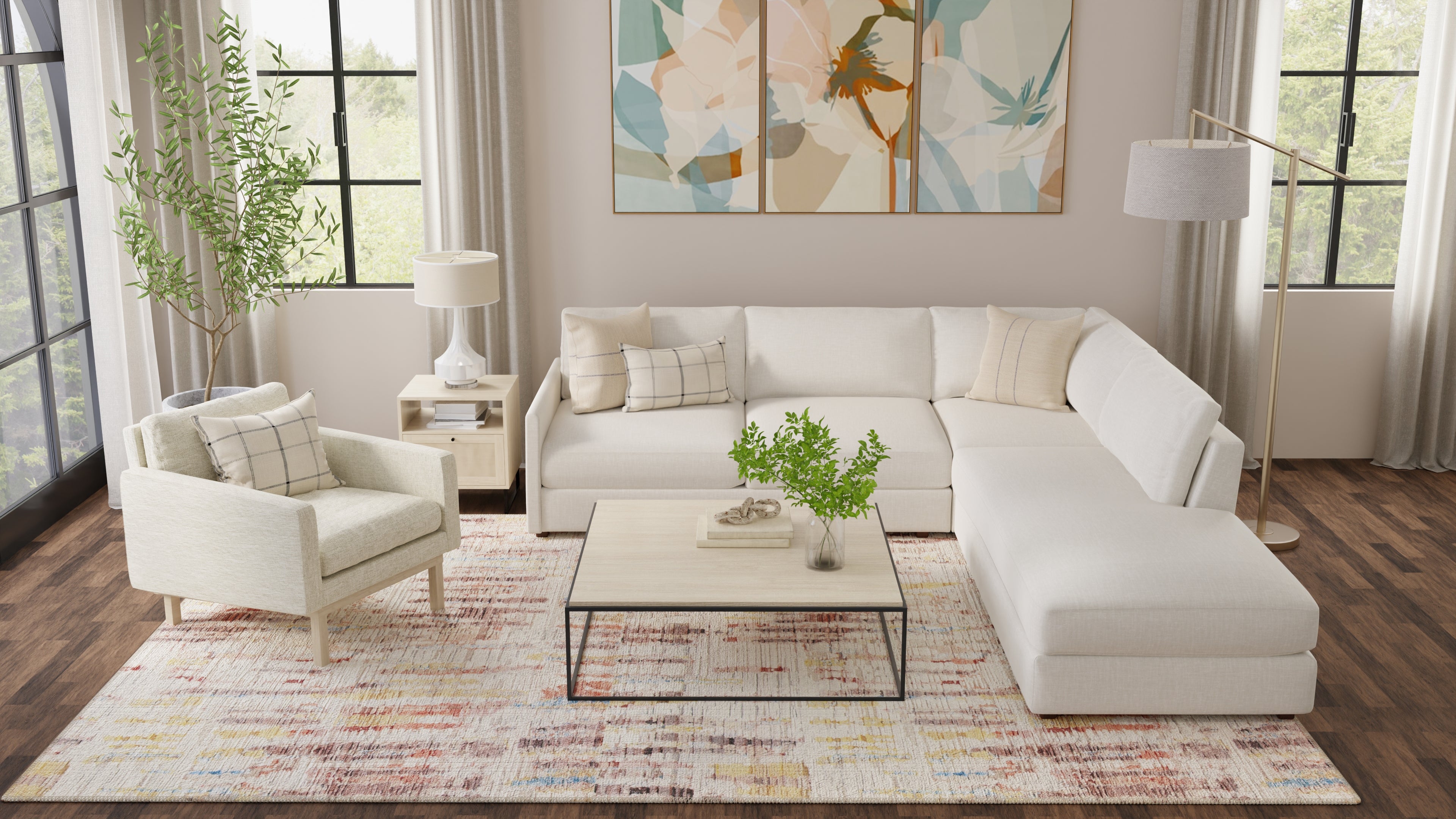 Aim for sizes like 8' x 10' or 9' x 12' when space allows, so that at least the front legs of sofas and chairs rest on the rug. This gives unity without making the furniture feel adrift. In more compact rooms, something like a 5' x 8' or 6' x 9' rug under the coffee table can define the space without overwhelming it. For an oversize rug that covers all of your furniture, let there be some floor visible around the edges to soften the transition between the rug and the wall, which adds balance and makes the rug feel intentional.